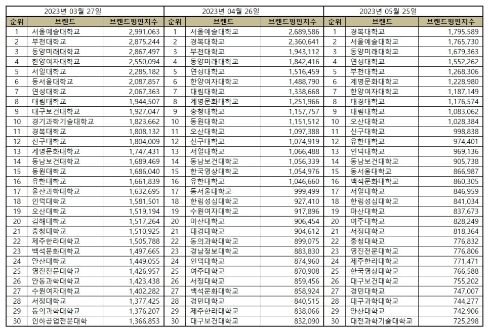 | [브랜드평판] 대학교 순위 최신 2023년 4월 빅데이터 분석결과 (20) | 2023.04.23 |
